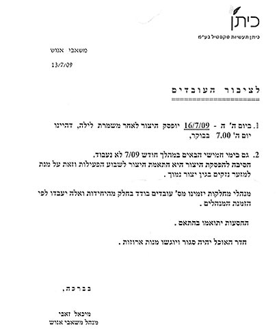 כך או כך, לידי ynet הגיע מכתב ששלחה הנהלת המפעל לעובדים על קיצוץ בימי העבודה. במכתב, מודיע מנהל משאבי אנוש, מיכאל זאבי, לעובדים, כי במהלך ימי חמישי בחודש יולי לא יעבדו. "הסיבה להספקת הייצור", מסבירה ההנהלה במכתב, "היא התאמת הייצור לשבוע הפעילות וזאת על מנת למזער נזקים בגין ייצור נמוך".