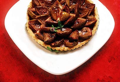 - ממלאים את קלתית הבצק בקרם שהתקרר. פורסים את התאנים לפרוסות ומסדרים אותן בצורה נאה על פני הקרם. מחממים מעט את הריבה ומברישים את הפרוסות.