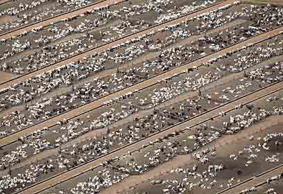 פרות רועות על קצה יער בברזיל (למעלה), ובשטח יער שנגדע (למטה). צילום: רויטרס