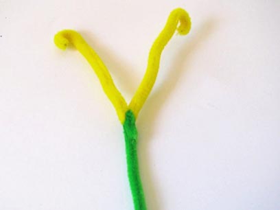 5. הכנת הגבעול: יוצרים לולאה בקצהו של מנקה מקטרות ירוק. הכנת האבקנים: חותכים פיסת מנקה מקטרות צהוב בגודל מתאים, מקפלים את מנקה המקטרות הצהוב לשניים ומשחילים בלולאה. מעגלים את קצוות האבקנים.