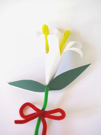 7. משחילים את הגבעול בחור הקטן שבבסיס הפרח, כשהלולאה שבקצה הגבעול משמשת כמעצור. משחילים את העלים ומדביקים לפרח במעט דבק. יוצרים סרט ממנקה מקטרות אדום ומצמידים לגבעול. מכינים ה-מ-ו-ן חבצלות ומעניקים בשמחה לכל מי שאוהבים. יצירה נעימה!