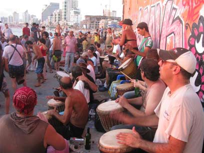 בימי שישי משעות אחה"צ ועד שמחשיך, נשמע בחוף המתופפים הדהוד תופים. עשרות מתופפים, קבועים ומזדמנים, באים לתופף בחברותא. רובם מקישים על תופי ג'מבה, מתופפים ושותים בירה ואלכוהול. עראק הפך פה ל"מיזם" עסקי – הוא נמזג לכוסות פלסטיק מתוך מיכל הנישא על גבו של בחור צעיר. וזה מתאים. זה מקום זרוק והסצנה הזויה. צלמים חובבים מתעדים טיפוסים צבעוניים בשלל כובעים, משקפי שמש וסיגריה בזווית הפה. איש אחד שמגלה את קעקועיו נע כאוטומט, מקיש על גליל מברזל ויוצר דיאלוג עם מתופף זה או אחר, ועם אישה אחת בביקיני שחור וכובע בוקרים, שלא מפסיקה לרקוד. התיפוף ממסטל לגמרי. את השבת הנכנסת מברכים בשירה. דייגים וזוגות יושבים על שובר הגלים ומתבוננים בשקיעה. בחוף למטה מג'נגלים, ובירה קונים במזנון. האם זו הגרסה המקומית למסיבות פול מון בגואה?