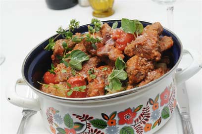 - מקמחים את בשר הטלה ומשחימים בשמן הזית, בסיר כבד. לאחר שהבשר מושחם מכל צידיו (כ-5 דקות) שולים את הבשר ושומרים במקום חם.