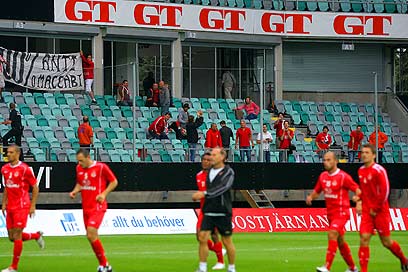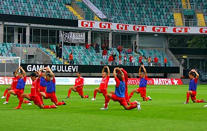 שחקני הפועל ת"א מתרגלים לכר הדשא בגטבורג (גבע תלם, האתר הרשמי)