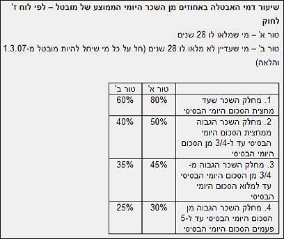 התשובה לשאלה של המובטל יגאל "כמה כסף מגיע לי" היא מורכבת הרבה יותר. הנה הטבלה שמסבירה, תחת "שיעורי הקצבה":