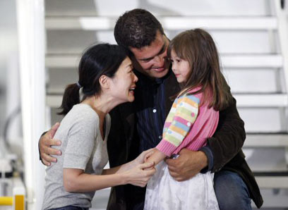 איונה לי מחבקת את בעלה ובתה בשדה התעופה, היום (צילום: רויטרס)