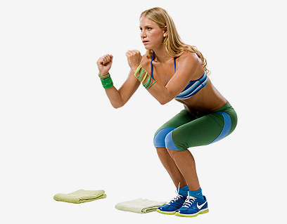 1. הניחי את המגבות במרווח של כמטר וחצי זו מזו ועמדי בעמידת סקווט (רגליים צמודות, ברכיים כפופות, ישבן לאחור, בטן אסופה) לצדה של מגבת אחת: