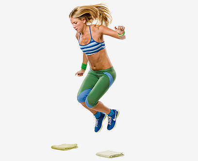 2. קחי תנופה עם הידיים וקפצי מעל המגבת כשאת נוחתת בין שתי המגבות (הקפידי על נחיתה רכה בברכיים כפופות).