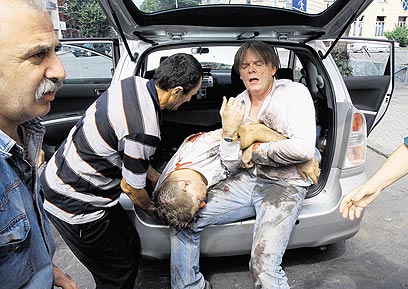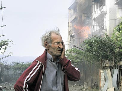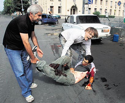12 באוגוסט :2008 צדוק יחזקאלי בכיכר סטלין בגורי זמן קצר אחרי פציעתו. רוכן מעליו: העיתונאי ההולנדי ג'רון אקרמן (צילום: רויטרס)