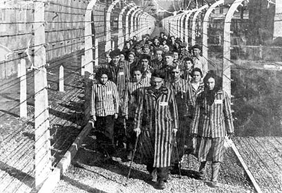 אסירים צועדים במחנה אושוויץ, ב-1945 (צילום ארכיון: AFP)