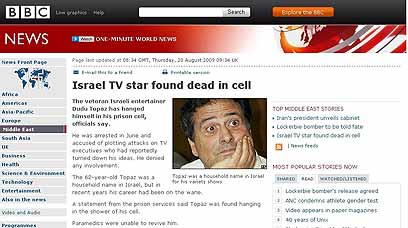 התאבדותו של "מלך הרייטינג" זוכה לעניין רב לא רק בישראל, אלא ברחבי העולם. שעות ספורות אחרי מותו של דודו טופז, וכלי התקשורת ברחבי העולם מדווחים היום (ה') בהרחבה על סופו של מלך הרייטינג השנוי במחלוקת. באתר "סקיי ניוז" הבריטית הוכתרה הכתבה בכותרת "'מלך הטלוויזיה' הישראלי תלה עצמו בכלא". עוד נכתב שם כי בכך נקבע "סוף דרמטי לסאגה של אלימות ואבק כוכבים שנמוג".
