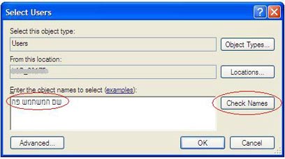 נלחץ על "הוסף" (Add), בחלון החדש ונקליד בתיבה המיועדת את שם המשתמש. נלחץ על "בדוק שם" (Check Names), כדי לאשר את קיומו של שם המשתמש הרלוונטי. נסגור את כל החלונות על ידי לחיצה על "אישור (Ok).