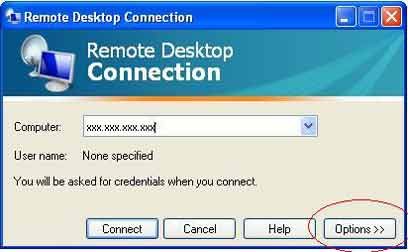 עכשיו אנחנו עוברים לעבוד עם המחשב השולט, המחשב שאיתו נבצע את הגישה מרחוק. כאמור, תחת "התחל", ואז "עזרים" ותחת הקבוצה "תקשורת", נמצא את Remote Desktop connection – נוכל לזהות את התוכנה הזו על ידי אייקון של מחשב וצלחת לווין לידו. נקליק עליו. בחלון התוכנה שנפתח, נקיש על "אפשרויות" (Options).