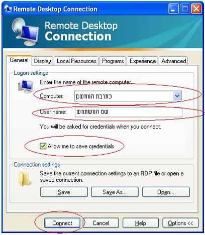 בשדה שם המשתמש, נרשום את שם המשתמש שלנו, אותו אחד שאישרנו לו גישה ממקודם, כאשר עסקנו בהגדרות במחשב המטרה. כעת כל שנותר לנו הוא לסמן את התיבה "אפשר לי לשמור את ההרשאות" (Allow me to save credentials) – וללחוץ על "התחבר" או Connect.
