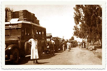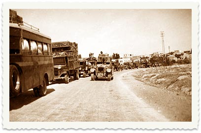 2. צולם במהלך שנות מאורעות 1936-9, התנועה בדרכים הייתה נעשית בשיירות מאובטחת. בתצלום: שיירה מחכה לליווי הצבאי. אין זיהוי למקום, אבל על האוטובוס שבראש השיירה רשום "קו 26 ירושלים".