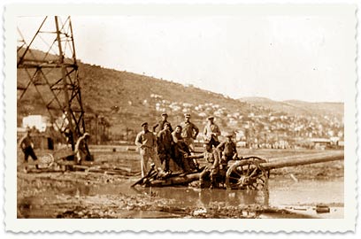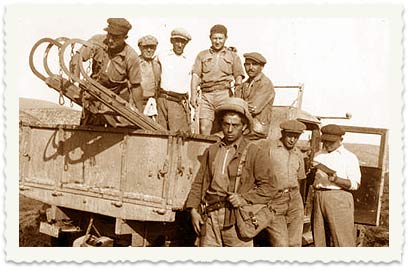 6. משאית ולצדה עובדי החברה, העוסקים בהקמת רשת חשמל בסביבות עמק הירדן. בחזית, עם תרמיל צד: יעקב.