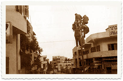 9. הקמת עמוד חשמל ברחוב החלוץ פינת שפירא בחיפה. בצד ימין של הרחוב - פוטו ברנר, ממול - פוטו מרדכי.