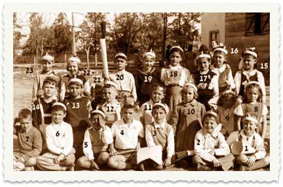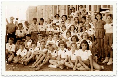 12. עפולה, 1949. תצלום קבוצתי בחצר בית הספר המחוזי של "זרם החינוך" (היום בית ספר יזרעאל): 2 - יעל חריט, 3 -רינה, 4 - חיליק פולק, 6 - נדב קוריס, 7 - נעמן קוריצקי, 8 - אמנון הירשברג, 12 - אסי מסינגר, 13 - פרויקה ורהפטיג, 17 - נועם וטנשטיין, 19 - דבורה פיודיק, 22 - תלמה מוגילניק, 28 - יואל קרימסקי, 35 - דבורה נוביץ', 36 - נילי קימל. באמצע למעלה - המורה בתיה אפשטיין.