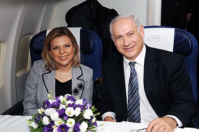 בנימין ושרה נתניהו במטוס בדרך ללונדון (צילום: עמוס בן גרשום, לע"מ)