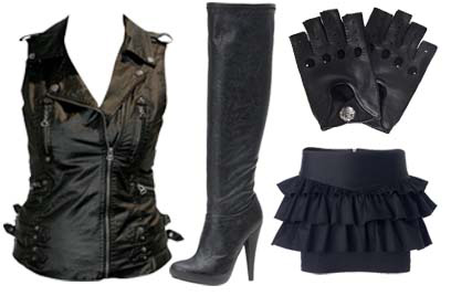 וסט כותנה שחור (סאקס, 440 שקל); כפפות חתוכות (מיס סיקסטי, 350 שקל); חצאית מיני קומות (מנגו, 189 שקל); מגפי סטילטו גבוהים (ספרינג, 399 שקל)