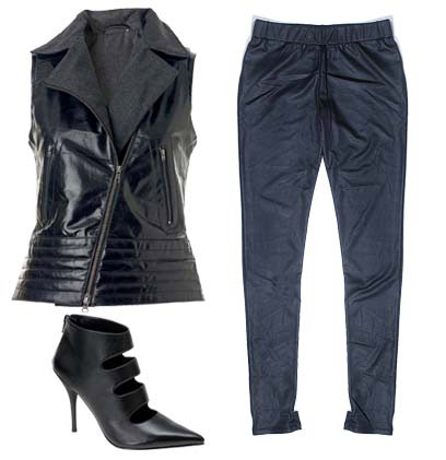 וסט שחור מעור בשילוב רוכסנים מנגו, 900 שקל); טייץ שחור מבריק (מאמז, 90 שקל); מגפוני סטילטו שחורים (אלדו, 599 שקל)
