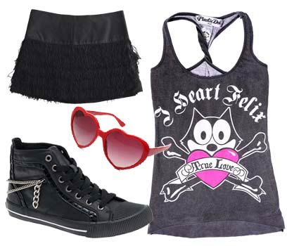 משקפי שמש לבבות (24/7, 60 שקל); חצאית מיני פרנזים (קסטרו, 229 שקל); נעלי ספורט (ספרינג, 229 שקל); גופיה (פלסטיק דול לטי מרקט, 120 שקל)