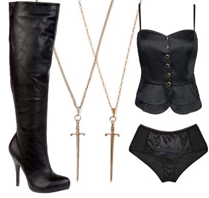גופיה בגזרת מחוך (טאגוומן, 229 שקל); תחתונים בגזרה גבוהה (הופ, 119 שקל); מגפי סטילטו גבוהים (נעלי מרקו, 600 שקל); שרשרת גולדפילד עם תליון חרב (רוביסטאר, 650-395 שקל)