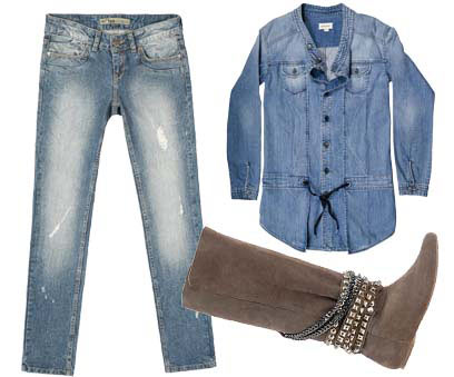 מגפי זמש בעיטור שרשראות וניטים (אלדו, 599 שקל); ג'ינס קרעים במראה משופשף (טאגוומן, 370 שקל); חולצת ג’ינס (דיזל, 450 שקל)
