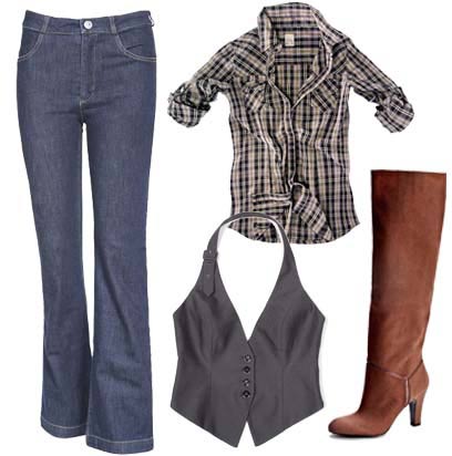 מגפי עור חומים (ניין ווסט, 899 שקל); וסט אפור צמוד (גולף, 189.90 שקל); ג’ינס כחול בגזרה גבוהה (אנה קיי, 620 שקל); חולצת משבצות בגוונים חומים (פול אנד בר, 129 שקל)