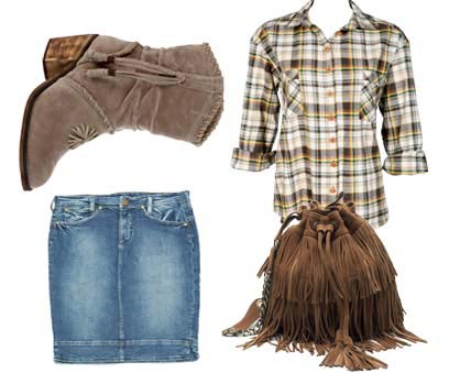 מגפוני זמש עם עקב עץ (נעלי מרקו, 450 שקל); חולצת כותנה משובצת ארוכה (אנה קיי, 400 שקל); חצאית ג’ינס בגזרת עיפרון (לי, 599 שקל); תיק זמש עם פרנזים (מנגו, 549.90 שקל)