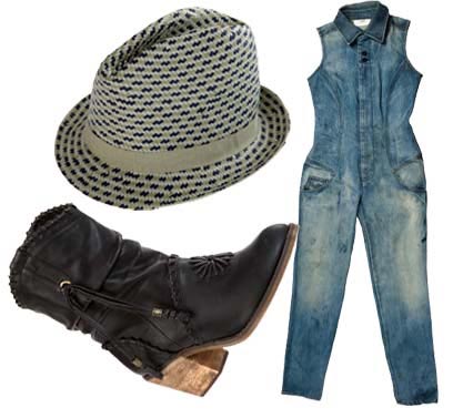 אוברול ג'ינס ארוך (דיזל, 1,400 שקל); מגפוני זמש עם עקב עץ (נעלי מרקו, 450 שקל); כובע (אקססורייז, 120 שקל)