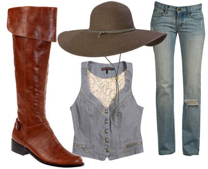 ג’ינס משופשף עם קרעים (לוצ'י, 114.90 שקל); כובע קש עם מקדם הגנה מהשמש (קולומביה, 179.90 שקל); מגפיים גבוהים (נעלי מרקו, 450 שקל); וסט ג’ינס בהיר (טאגוומן, 200 שקל)
