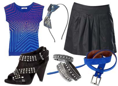 חצאית ברך עם קפלים (סאקס, 278 שקל); חולצה בהדפס כוכבים (רנואר, 89 שקל); חגורה כחולה דקה (זארה, 139.90 שקל); קשת לשיער בעיטור פפיון (אקססורייז, 45 שקל); מגפונים נמוכים בעיטור ניטים (זארה, 399 שקל); צמידים בעיטור אבנים (אלדו, 79 שקל)