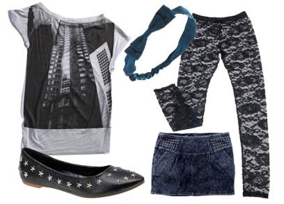 חצאית מיני ג'ינס בשילוב ניטים (זארה, 159 שקל); טייץ תחרה שחור (אלדו, 129 שקל); סרט כותנה לשיער בעיטור פפיון (אקססורייז, 30 שקל); חולצה מודפסת עם צווארון סירה (קסטרו, 129 שקל); נעלי סירה בעיטור ניטים (ספרינג, 229 שקל)
