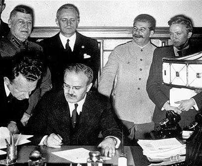 סטלין עם הגב לקיר. חתימת חוזה ריבנטרופ-מולוטוב (צילום: AP)