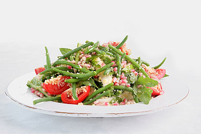 - מעבירים את השעועית, הבורגול ושאר החומרים מלבד גרגירי הרימון לקערה ומערבבים.