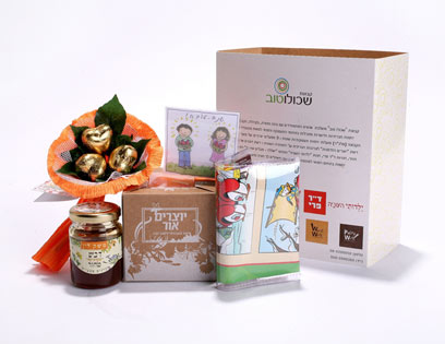 ברשת "שכולו טוב" מציעים מוצרים שונים, שיצרו אנשים בעלי צרכים מיוחדים מ-50 עמותות וארגונים חברתיים, שמשתלבים בקהילה באמצעות תעסוקה. הערכה בתמונה כוללת ארנק קומיקס, כרטיס ברכה מעוצב, נר איכותי במארז שהופך אח"כ לכלי אחסון לכלי כתיבה, זר שוקולדים וצנצנת דבש. מחירה 40 שקלים.