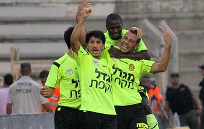 שחקני נתניה חוגגים. נא לשמור מרחק (צילום: עוז מועלם)