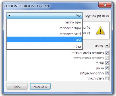 תוכלו לבחור שם בדיוק מה למחוק - היסטוריית גלישה, היסטוריית טפסים, קובצי Cookie (עוגיות), התחברויות פעילות למייל ולאתרים שונים ועוד. תוכלו גם לבחור אם לנקות את העקבות שלכם ממשכי זמן שונים, או לנקות את כל ההיסטוריה לחלוטין.