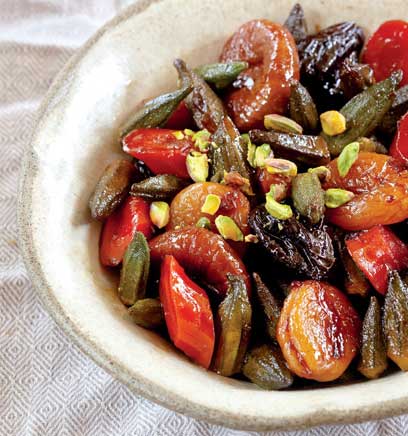 - מעבירים את הבמיה עם הפירות המיובשים לצלחת הגשה ומפזרים מעל פיסטוקים קצוצים. מגישים על אורז לבן.