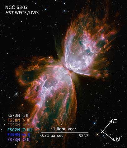 NGC 6302 נמצאת בתוך שביל החלב שלנו, במרחק של כ-3,800 שנות אור בכיוון קבוצת עקרב. הגז הזוהר הוא שכבת הגז העליונה של הכוכב שהושלה ממנו לפני כ-2,200 שנה. ה'פרפר' נמתח למרחק של למעלה משתי שנות אור, כמחצית הדרך בין השמש לכוכב הקרוב אלפא קנטאורי.