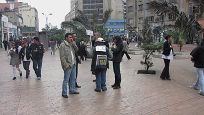 משכיר טלפונים ניידים בבוגוטה. המחיר על גבו, וסביבו לקוחות המדברים בטלפונים הקשורים אליו בשרשראות