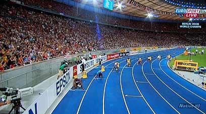 האצן הסוחף בולט, מתכונן לריצת 200 המטרים, בה ישבור שיא עולם בשנית, גם כאן, התמונה חדה ויש תחושה של עומק ביציע העמוס צופים.