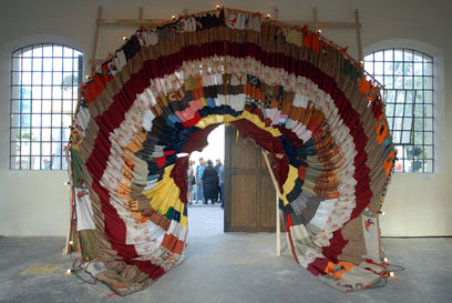 "הארץ הזו זקוקה לקרקס מול הים הקדמון", מצטטת מושנזון את שבתאי בטקסט התערוכה, ומציבה שער מטלאי בדים של גילי אבישר, המזכיר אוהל קרקס או תיאטרון נודד. עבודת הוידיאו של אבישר בונה ומפרקת קונסטרוקציה של אוהל קרקס. העבודה מציעה את מקום מעט מופרך, בנוסח סרטים של פדריקו פליני, או הסרט "תעלת בלאומיך", בו נחפרת תעלה באמצע רחוב אלנבי. למעשה, בכך היא מרחיקה אותנו מה"כאן ועכשיו" הישראלי.