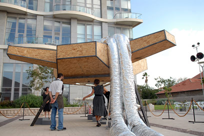 מיצב מצחיק וחכם הוא המיצב "הומונים" (ביקור סאדאת) של האמנים בועז ארד, גיא בן נר, רותי סלע ודורון רבינא, שאצרה מעיין אמיר. יש בו ממטרות מתיזות מים על מטוס מחימר רטוב. כשמסתובבים סביב גוף המטוס הענק, שנראה כמו שלב בתהליך פיסולי, רואים גרם מדרגות ואת סאדאת נשיא מצרים שחום מחימר.