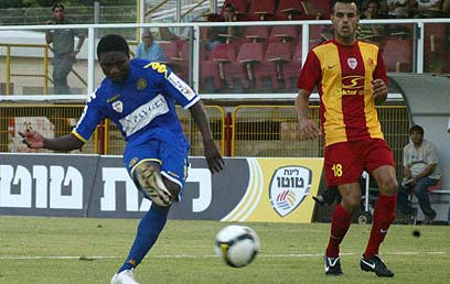דקה שביעית: פריצה של יובל אבידור משמאל הסתיימה בכדור רוחב לעמנואל מאיוקה, שנבלם ברגע הבעיטה על ידי דראגן סטויקיץ'.