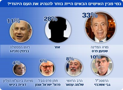 לו הדבר היה תלוי בנו, את מי מהאישים הבאים היינו בוחרים להנהיג את העם היהודי? 33% בחרו בנשיא המדינה שמעון פרס, 11% בראש הממשלה בנימין נתניהו, ו-10% ברמטכ"ל גבי אשכנזי. אחריהם ברשימה: הרב הראשי לישראל שלמה עמאר (8%), חתן פרס נובל בכלכלה פרופ' ישראל אומן (6%), נשיאת בית המשפט העליון השופטת דורית ביניש (4%) או אדם אחר (28%).