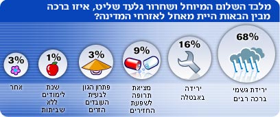 השאלה הראשונה הייתה: "בראש השנה נוהגים לאחל ברכות לשנה החדשה. מלבד השלום המיוחל ושחרור גלעד שליט, איזו ברכה מבין הבאות היית מאחל לאזרחי המדינה יותר מכל?". 68% בחרו ב"ירידת גשמי ברכה רבים", 16% מעדיפים ירידה באבטלה, 9% מייחלים יותר למציאת תרופה לשפעת החזירים, 3% מבקשים בעיקר פיתרון הגון לבעיית העובדים הזרים, 1% אמרו: "שנת לימודים ללא שביתות", והיתר (3%) לא השיבו. פילוח להגדרות דתיות מלמד כי בכל הקבוצות מוטרדים בעיקר ממשבר המים, וגשמי הברכה עדיפים מבחינתם משמעותית על כל האיחולים האחרים.