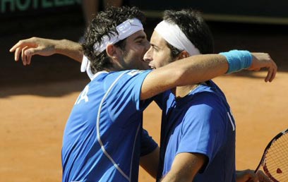 שוייץ של רוג'ר פדרר תיאלץ לחכות ליום ראשון כדי לחגוג, אחרי שבזוגות בשבת סטניסלאס וורינקה ומארק קיודינלי נכנעו 6:2, 6:4, 7:6 (3) מול סימונה בוללי ופוטיטו סטראצ'ה.