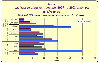 בשנים 2003-2007 חלה עלייה של 7% בהיקף הצעירים המוותרים על מזון (14% לעומת 21%) עקב קשיים כלכליים. 23% מהנשים דיווחו כי ויתרו על מזון לעומת 18% מהגברים. שיעור החרדים שוויתרו על מזון כפול משיעור החילונים (30% לעומת 15% בהתאמה). מצבם של הערבים הוא הקשה ביותר: משנת 2003 עד 2007 שיעור המוותרים על מזון יותר מהוכפל (21% לעומת 50% בהתאמה).